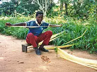 Removing the fibrous inner layer of the palm frond leaves as a first step in making raffia rope in Bandundu Province, Democratic Republic of the Congo.