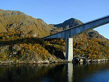 The Raftsund Bridge (Norwegian: Raftsundbrua) is a two-lane cantilever road bridge in Hadsel Municipality in Nordland county, Norway. The bridge carries the European route E10 highway and it crosses the Raftsundet strait between the islands of Austvågøya and Hinnøya. The bridge is 711 metres (2,333 ft) long, the main span is 298 metres (978 ft), and the maximum clearance to the sea beneath the bridge is 45 metres (148 ft). The bridge has 4 spans.[1]