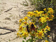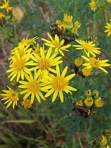 Ragwort is a food plant for the larvae of Cochylis atricapitana, Phycitodes maritima, and Phycitodes saxicolais. Ragwort is best known as the food of caterpillars of the cinnabar moth Tyria jacobaeae. They absorb alkaloids from the plant and become distasteful to predators, a fact advertised by the black and yellow warning colours. The red and black, day-flying adult moth is also distasteful to many potential predators. The moth is used as a control for ragwort in countries in which it has been introduced and become a problem, like New Zealand and the western United States.[14] As both larvae and adults are distinctly colored and marked, identification of cinnabars is easy outside of their natural range, and grounds and range keepers can quickly recognize them. In both countries, the tansy ragwort flea beetle (Longitarsus jacobaeae) has been introduced to combat the plant. Another beetle, Longitarsus ganglbaueri, also feeds on ragwort, but will feed on other plants as well, making it an unsuitable biological control.[15] Another biological control agent introduced in the western United States is the ragwort seed fly, although it is not considered very effective at controlling ragwort.[16] The biological control of ragwort was already used in the 1930s.[17]