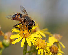 Furthermore, English Nature identifies a further 117 species that use ragwort as a nectar source whilst travelling between feeding and breeding sites, or between metapopulations.[18] These consist mainly of solitary bees, hoverflies, moths, and butterflies such as the small copper butterfly (Lycaena phlaeas). Pollen is collected by solitary bees.[19]