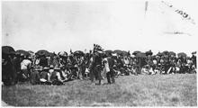 Julia M. Buttree (the wife of Ernest Thompson Seton) describes the rain dance of the Zuni, along with other Native American dances, in her book The Rhythm of the Redman.[2][3] Feathers and turquoise, or other blue items, are worn during the ceremony to symbolize wind and rain respectively. Details on how best to perform the Rain Dance have been passed down by oral tradition.[4] In an early sort of meteorology, Native Americans in the midwestern parts of the modern United States often tracked and followed known weather patterns while offering to perform a rain dance for settlers in return for trade items. This is best documented among the Osage and Quapaw Indian tribes of Missouri and Arkansas.[5]