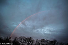 A sleetbow forms in the same way as a typical rainbow, with the exception that it occurs when light passes through falling sleet (ice pellets) instead of liquid water. As light passes through the sleet, the light is refracted causing the rare phenomena. These have been documented across United States with the earliest publicly documented and photographed sleetbow being seen in Richmond, Virginia on December 21, 2012.[57] The last public photographed sleetbow was January 24, 2021 in South Devon, United Kingdom. Just like regular rainbows, these can also come in various forms, with a monochrome sleetbow being documented on January 7, 2016 in Valparaiso, Indiana.