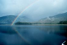 A reflected rainbow may appear in the water surface below the horizon.[39] The sunlight is first deflected by the raindrops, and then reflected off the body of water, before reaching the observer. The reflected rainbow is frequently visible, at least partially, even in small puddles.
