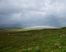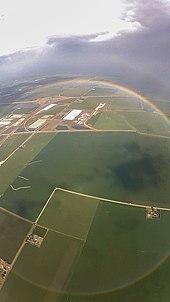 In theory, every rainbow is a circle, but from the ground, usually only its upper half can be seen. Since the rainbow's centre is diametrically opposed to the sun's position in the sky, more of the circle comes into view as the sun approaches the horizon, meaning that the largest section of the circle normally seen is about 50% during sunset or sunrise. Viewing the rainbow's lower half requires the presence of water droplets below the observer's horizon, as well as sunlight that is able to reach them. These requirements are not usually met when the viewer is at ground level, either because droplets are absent in the required position, or because the sunlight is obstructed by the landscape behind the observer. From a high viewpoint such as a high building or an aircraft, however, the requirements can be met and the full-circle rainbow can be seen.[31][32] Like a partial rainbow, the circular rainbow can have a secondary bow or supernumerary bows as well.[33] It is possible to produce the full circle when standing on the ground, for example by spraying a water mist from a garden hose while facing away from the sun.[34]