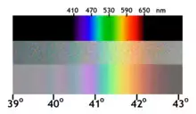 The colour pattern of a rainbow is different from a spectrum, and the colours are less saturated. There is spectral smearing in a rainbow owing to the fact that for any particular wavelength, there is a distribution of exit angles, rather than a single unvarying angle.[13] In addition, a rainbow is a blurred version of the bow obtained from a point source, because the disk diameter of the sun (0.5°) cannot be neglected compared to the width of a rainbow (2°). Further red of the first supplementary rainbow overlaps the violet of the primary rainbow, so rather than the final colour being a variant of spectral violet, it is actually a purple. The number of colour bands of a rainbow may therefore be different from the number of bands in a spectrum, especially if the droplets are particularly large or small. Therefore, the number of colours of a rainbow is variable. If, however, the word rainbow is used inaccurately to mean spectrum, it is the number of main colours in the spectrum.