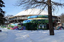 A triodetic dome, costing $175,000, was constructed over the theatre in 1970.[5] Further renovations were completed in 1975, which resulted in a modernized facility but a reduction of 600 seats. The renovations involved a labour dispute and a temporary move to the Manitoba Centennial Concert Hall.[6] In 1986, a fly gallery, carpentry and paint shops, classrooms and expanded change rooms were added to the facility.[3] The 1986 renovation involved replacing an original timber arch. A commemorative plaque and a replica of the arch were erected in front of the building in 1988.[7]