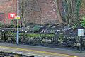 The station buildings are listed, they were constructed about 1860-68 by the London & North Western Railway, in a classical style, red brick, English bond, stone dressings, shallow hipped Welsh slate roof, modillion eaves cornice, single storey, linear plan.[4][5]