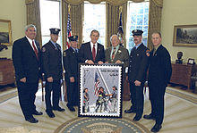 Michael Kessel, a Manhattan attorney, suggested to U.S. Representative Gary Ackerman that the photo be used for a stamp, and the "Heroes 2001" stamp, USA Scott #B2, was unveiled on March 11, 2002, by President George W. Bush, in a ceremony attended by Franklin, Johnson, Eisengrein, and McWilliams. These stamps were semipostals: they had a purchase price (45¢) higher than their postage value (34¢), with the balance given to the Federal Emergency Management Agency's relief efforts. A special exception was thus made to the normal requirement by the United States Postal Service that subjects of stamps be deceased.