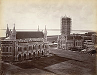 The Rajabai Clock Tower was designed by Sir George Gilbert Scott, an English architect.[2] He modeled it on Big Ben in London.The foundation stone was laid on 1 March 1869 and construction was completed in November 1878. The total cost of construction came to ₹550,000, a large amount of money for the time period. A portion of the total cost of construction was donated by Premchand Roychand, a prosperous broker who founded the Bombay Stock Exchange on the condition that the tower be named after his mother Rajabai.[3]