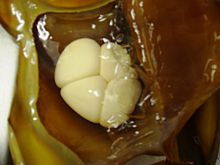 Skates produce their young in an egg case called a mermaid's purse. These egg cases have distinct characteristics that are individualized to each species.[11][12] This makes a great tool for identifying different species of skates. One of these identifiable structures is the keel. The keel is a flexible ridge that runs along the outside of the structure. Another characteristic is the number of embryos in the egg case. Some species contain only one embryo while others can have up to seven. The size of the fibrous shell around the case is another characteristic. Some species have thick layers on the exterior, however other species do not have the presence of this layer.