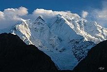 Rakaposhi (Urdu: راکاپوشی / رَکی پُوشِہ) is a mountain in the Karakoram mountain range in the Gilgit-Baltistan territory of Pakistan.[3] It is situated in the middle of the Bagrote valley , Nagar valley and danyor, approximately 100 km (62 mi) north of the city of Gilgit. Rakaposhi is also known as Dumani ("Mother of Mist" or "Mother of Clouds"). It is ranked 27th highest in the world.