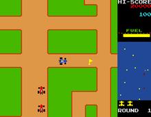 Rally-X[a] is a 1980 maze chase arcade game developed and published by Namco. The player controls a blue racecar that must collect all of the yellow flags in each stage, while avoiding red enemy cars and rocks. A radar is displayed at the right of the screen, showing the location of the player, remaining flags and enemies, alongside a fuel meter that gradually depletes as the stage progresses. Enemy cars can be stunned by releasing smoke screens, which will deplete the fuel meter.