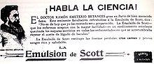 After returning to Puerto Rico in 1859, Betances established a very successful surgery and ophthalmology practice in Mayagüez.[23] Even fierce political enemies such as Spanish pro-monarchy journalist José Pérez Morís regarded Betances as the best surgeon in Puerto Rico at the time. His good reputation in Puerto Rico would survive his stay in the island nation for many years. In 1895, while Betances was living in Paris, the manufacturers of the Emulsión de Scott (a codfish liver oil product that is still sold today, manufactured by GlaxoSmithKline in modern times), paid an endorsement fee to Betances to have him appear on advertisements on Spanish language magazines and newspapers all over New York City and the Caribbean, based on his solid reputation as a doctor.[24][25]