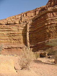 Nahal Ardon in the east of the makhtesh contains several vertical dikes. Occasional geodes of celestine can be found next to some of them.[1]