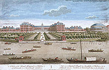 The centrepiece of Ranelagh was a rococo rotunda, which figured prominently in views of Ranelagh Gardens taken from the river. It had a diameter of 120 feet (37 metres) and was designed by William Jones, a surveyor to the East India Company. The central support housed a chimney and fireplaces for use in winter. From its opening, the Rotunda at Ranelagh Gardens was an important venue for musical concerts. In 1765, the nine-year-old Mozart performed in this showplace. Canaletto painted the gardens, and painted the interior of the Rotunda twice, for different patrons.[2] The rotunda was closed in 1803 and demolished two years later. The organ was moved to All Saints Church, Evesham.[3]