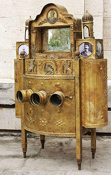 19th-century Chinese peep shows were known by many names including la yang p'ien (Chinese: 拉洋片; pinyin: lā yáng piān; lit. 'pulling foreign picture cards'). Sometimes the showman would perform for a crowd with puppets or pictures outside the box and then charge people extra to look through the holes. In Ottoman Syria a form of peep show called sanduk al-ajayib ("wonder box") existed, which the storyteller carried on his back. The box had six holes through which people could see scenes backlit by a central candle. Sanduk al-ajayib stories were about contemporary figures and events, or showed scenes of heaven and hell.[11]
