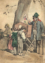 In the 17th and 18th century peep shows were exhibited on streets and fairs across Europe by itinerant showmen, competing with other entertainment like dancing bears, jugglers, conjurers, et cetera.[4] Their wooden cabinets could have several viewing holes and contain sets of pictures to be set into a viewing position by pulling a corresponding string. The show was accompanied by spoken recitation that explained or dramatized what was happening inside. The boxes were often decorated inside to resemble theatrical scenes.