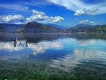 With a surface area of about 57 km2, Laut Tawar is the largest lake in Aceh Province. The lake is located in the Gayo plateau about 1,200 meters above sea level.[3] It was formed by the Dorman volcano,[4] and is surrounded by Mount Bukit Barisan with its highest peak around 2,000 meters above sea level. There are approximately 25 small rivers that flow into the lake, originating from 18 catchment areas, with the discharge varying between 11 and 2554 L/s. The Peusangan River is the only outlet. The lake is surrounded by forests that have undergone intensive logging. Plantations, rice fields, and human settlements have a negative impact on the ecology of the lake.[5] The lake plays an important role for the indigenous Gayo tribe, such as being a source of clean water, irrigation, industry, and fisheries.
