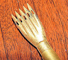 A rastrum (or raster) is a five-pointed writing implement used in music manuscripts to draw parallel staff lines when drawn horizontally across a blank piece of sheet music. The word "raster" is derived from the Latin for "rake". Rastra were used to draw lines on paper that had not been pre-ruled, and were widely used in Europe until printed staff paper became cheap and common in the nineteenth century. Some rastra are able to draw more than one staff at a time. Rastrology, the study of the use of the rastrum, is a branch of music manuscript studies that uses information about the rastrum to help find the date and provenance of musical materials.