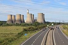The power station occupies a prominent position next to the A453, close to junction 24 of the M1, the River Trent and the Midland Main Line (adjacent to East Midlands Parkway station) and dominates the skyline for many miles around with its eight cooling towers and 199 m (653 ft) tall chimney. It has four coal-fired boilers made by Babcock & Wilcox, each of which drives a 500 megawatt (MW) Parsons generator set. There were four boilers rated at 435 kg/s, steam conditions were 158.58 bar at 566°C, with reheat to 566°C.[2] This gives the station a total generating capacity of 2,116 MW, which is enough electricity to meet the needs of approximately 2.02 million homes.[3] There were 4 x 17.5 MW auxiliary gas turbines on the site, these had been commissioned in December 1966.[2]
