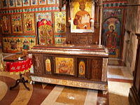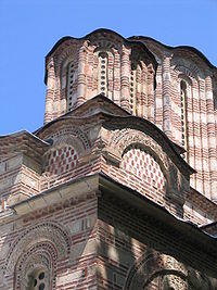 The Ravanica Monastery (Serbian: Манастир Раваница / Manastir Ravanica) is a Serbian Orthodox monastery on Kučaj mountains near Senje, a village in Ćuprija municipality in Central Serbia. It was built in 1375–1377 as an endowment of prince Lazar of Serbia, who is buried there. The Ravanica church is called the birthplace of the new artistic movement "Morava school" because of architectural and artistic features. It is original blend of the Mount Athos and the cross-in-square five-domed model that became standard in the time of King Milutin.[1]