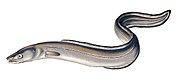 Neopterygii | ![]() | Neopterygii (new fins) is a subclass of ray-finned fish that appeared somewhere in the Late Permian. There were only few changes during its evolution from the earlier actinopterygians. Neopterygians are a very successful group of fishes because they can move more rapidly than their ancestors. Their scales and skeletons began to lighten during their evolution, and their jaws became more powerful and efficient. While electroreception and the ampullae of Lorenzini is present in all other groups of fish, with the exception of hagfish, neopterygians have lost this sense, though it later re-evolved within Gymnotiformes and catfishes, who possess nonhomologous teleost ampullae.[17] |