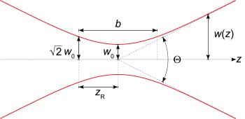 where is the wavelength (the vacuum wavelength divided by , the index of refraction) and is the beam waist, the radial size of the beam at its narrowest point. This equation and those that follow assume that the waist is not extraordinarily small; .[3]