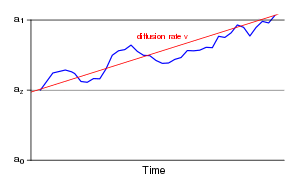 The drift-diffusion model (DDM) is a well-defined mathematical formulation to explain observed variance in response times and accuracy across trials in a (typically two-choice) reaction time task.[33] This model and its variants account for these distributional features by partitioning a reaction time trial into a non-decision residual stage and a stochastic "diffusion" stage, where the actual response decision is generated. The distribution of reaction times across trials is determined by the rate at which evidence accumulates in neurons with an underlying "random walk" component. The drift rate (v) is the average rate at which this evidence accumulates in the presence of this random noise. The decision threshold (a) represents the width of the decision boundary, or the amount of evidence needed before a response is made. The trial terminates when the accumulating evidence reaches either the correct or the incorrect boundary.[34]