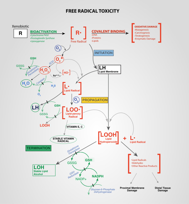 ROS are constantly generated and eliminated in the biological system and are required to drive regulatory pathways.[47] Under normal physiological conditions, cells control ROS levels by balancing the generation of ROS with their elimination by scavenging systems. But under oxidative stress conditions, excessive ROS can damage cellular proteins, lipids and DNA, leading to fatal lesions in the cell that contribute to carcinogenesis.