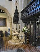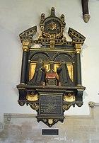The main body of the church dates from the late 11th Century, however in 1539, the Abbey was dissolved on the orders of King Henry VIII. In the Reformation that followed, St Mary's church was stripped of its altar, statues and stained glass, and by 1550 was in need of extensive repair. Between the years of 1551 and 1555 the church was extensively restored, using quantities of masonry and timber from the ruins of the Abbey. Contemporary accounts include payments for the dismantling and carriage of the Abbey's choir and nave roof, and is believed that the pillars which now separate the Minster's south aisle from the nave came from the Abbey.[1][2] The baptismal font stands on the plinth of an earlier font and dates to 1616. A gift from the Vachell family, it is octagonal in shape and is carved with the arms of the Vachell, Knollys and Reades families who intermarried. Some of the carved shields represent Tudor roses and originally would have been painted in their heraldic colours. On the north wall of the chancel is an impressive black and gold monument to William Kendricke and his wife dated 1635. William Kendricke was churchwarden at the Minster from 1607 to 1610 and was a considerable benefactor of the church.