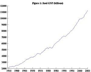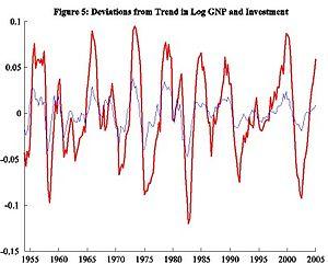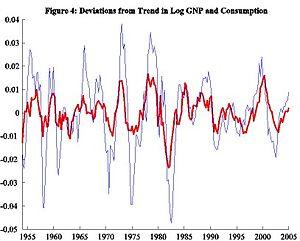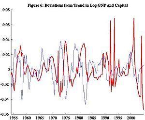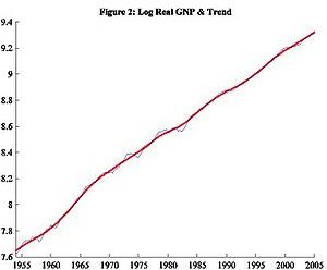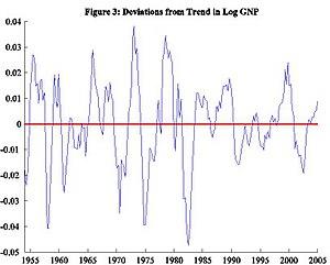 Figure 1 shows the time series of real GNP for the United States from 1954–2005. While we see continuous growth of output, it is not a steady increase. There are times of faster growth and times of slower growth. Figure 2 transforms these levels into growth rates of real GNP and extracts a smoother growth trend. A common method to obtain this trend is the Hodrick–Prescott filter. The basic idea is to find a balance between the extent to which general growth trend follows the cyclical movement (since long term growth rate is not likely to be perfectly constant) and how smooth it is. The HP filter identifies the longer term fluctuations as part of the growth trend while classifying the more jumpy fluctuations as part of the cyclical component.