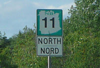 In the United States and Canada, reassurance markers (also called reassurance shields or confirming shields) usually take the form of a shield displaying the road number on an elevated pole, with a plate above or below it indicating the "official" direction of that side of the route. (The official long-range direction may differ from the short-range direction; for example, a large stretch of I-90 near Buffalo, New York runs north-south, although the route is officially east-west.) The direction portion of the sign confirms that the driver is going the right way along the desired road. On larger roads, reassurance markers are sometimes posted on a sign that is elevated on a gantry.