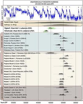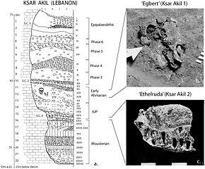 - ^ a b c Douka K, Bergman CA, Hedges RE, Wesselingh FP, Higham TF (11 September 2013). "Chronology of Ksar Akil (Lebanon) and implications for the colonization of Europe by anatomically modern humans". PLOS One. 8 (9): e72931. Bibcode:2013PLoSO...872931D. doi:10.1371/journal.pone.0072931. PMC 3770606. PMID 24039825.