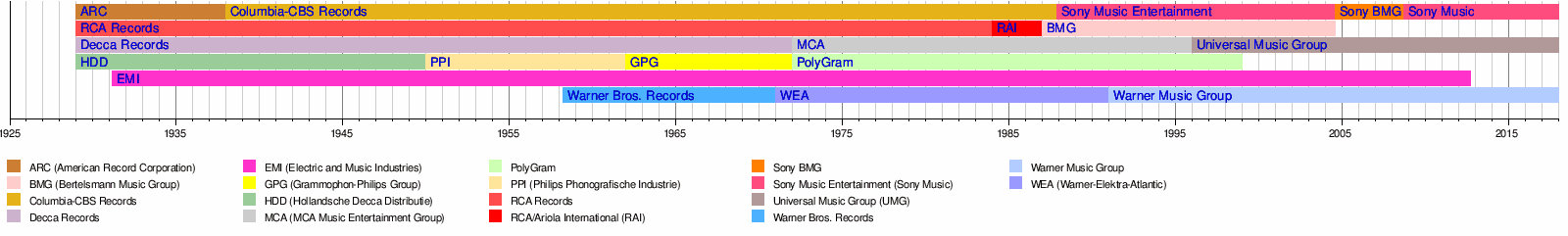 | Warner Music Group (NASDAQ: WMG) | 1958 | New York City, New York, United States | Atlantic Records Group Alternative Distribution Alliance Elektra Records Rhino Entertainment Warner Records Warner Chappell Music | 12.1% |
