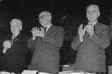 The Communist authorities of the Polish People's Republic and some Polish citizens desired to erase all traces of German rule.[66] The "Recovered Territories" after the transfer still contained a substantial German population. The Polish administration set up a "Ministry for the Recovered Territories", headed by the then deputy prime minister Władysław Gomułka.[67] A "Bureau for Repatriation" was to supervise and organize the expulsions and resettlements. According to the national census of 14 February 1946, the population of Poland still included 2,288,000 Germans, of which 2,075,000—nearly 91 per cent—lived in the Recovered Territories. By this stage Germans still constituted more than 41 per cent of the inhabitants of these regions. However, by 1950 there were only 200,000 Germans remaining in Poland, and by 1957 that number fell to 65,000.[68]