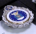 The U.S. Air Force Reserve Command Recruiting Service Badge is authorized to all personnel who are assigned to Air Force Reserve Command recruiting stations. The badge is worn as a decoration centered on the left uniform pocket for males and centered on the right side of the uniform above the nameplate for females. The badge may be modified with a gold rope that incorporates a gold banner at the bottom of the badge that denotes the recruiter's position (Staff, Assistant Senior, Senior, or Medical), referred to as the Staff Badge. Additionally, the badge may be modified with a gold wreath which incorporates a gold banner atop the badge denoting a recruiter's personal achievement (100, 200, or Master); these badges are called "Century Club Badges." Staff, Assistant Senior, Senior, or Medical recruiters with century awards have recruiter badges that are modified with a gold wreath that incorporates gold banners at the top and bottom of the badge denoting both achievement and position; these badges are called "Dual Century Club Badges." Recent official Air Force photographs of Air Force Reserve Command Recruiters wearing the Staff and Dual Century Club Badges have a numerical designation in the bottom banner where the recruiter's position is usually noted. This numerical designation could be a change in how positions are identified on the recruiter badge; however, no documentation describing this change has been found.[15][16][17]