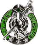 U.S. Army recruiter badges are presented to active and reserve Army personnel who are assigned to the U.S. Army Recruiting Command (USAREC). The Basic Recruiter Identification Badge is a silver crest that incorporates an eagle with raised wings straddling a flaming torch surrounded by a green banner with the words "U.S. Army Recruiter." Army Recruiters can compete for the Gold Recruiter Badge which is a gold variant of the Basic Recruiter Identification Badge and work towards qualifying for the Master Recruiter Badge.[1][2][3]