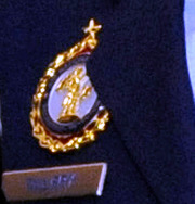 The U.S. Air National Guard (ANG) Recruiting Service Badge is authorized to all personnel who are assigned to Air National Guard recruiting stations. The badge is worn as a decoration centered on the left uniform pocket for males and centered on the right side of the uniform above the nameplate for females. The badge is issued in three degrees; basic, senior, and master. The senior and master versions of the badge have a star or star with wreath, respectively, which are perched atop of the badge. There are gold variants of each badge which denote personal awards in recruiting and retention.[15][18][19]