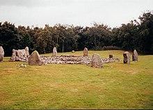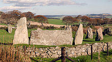 A recumbent stone circle is a type of stone circle that incorporates a large monolith, known as a recumbent, lying on its side. They are found in only two regions: in Aberdeenshire in the north-east of Scotland and in the far south-west of Ireland in the counties of Cork and Kerry. In Ireland, the circles are now more commonly called Cork–Kerry or axial stone circles.[1] They are believed by some archaeologists such as Aubrey Burl to be associated with rituals in which moonlight played a central role, as they are aligned with the arc of the southern moon.[2] Recent excavations at Tomnaverie stone circle have suggested that no alignment of the circle was intended.