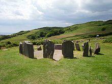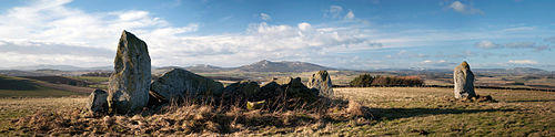 Irish recumbent stone circles take a rather different form, with the recumbent being small and placed in an isolated position on the southwest side while the two tallest stones, known as portals, stand opposite on the northeast side.[1] It is highly likely that the recumbent stone circles of northeast Scotland and south-west Ireland are related, given how similar they are, but the geographical distance between them – several hundred kilometers of mountain terrain, bogs and sea – has prompted debate about how exactly the relationship came about. It is possible that rather than there being direct communication between the two locations, the ideas underlying recumbent stone circles were transmitted by a single influential person or group of people who – for whatever reason – left one location and perhaps settled in the other.[1] Because of the differences in design they are now more commonly called Cork–Kerry or axial stone circles.[9]