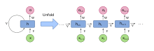 Fully recurrent neural networks (FRNN) connect the outputs of all neurons to the inputs of all neurons. This is the most general neural network topology because all other topologies can be represented by setting some connection weights to zero to simulate the lack connections between those neurons. The illustration to the right may be misleading to many because practical neural network topologies are frequently organized in "layers" and the drawing gives that appearance. However, what appears to be layers are, in fact, different steps in time of the same fully recurrent neural network. The left-most item in the illustration shows the recurrent connections as the arc labeled 'v'. It is "unfolded" in time to produce the appearance of layers.