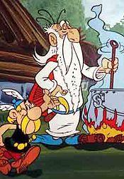 Getafix is very similar to many wise old men who act as mentors and father-figures to the heroes, such as Merlin or Gandalf. In the earlier books however, Getafix came across more as just a friend of the protagonists rather than a wise old counselor. He was also, from the very beginning, shown as a figure of fun and had a wonderful sense of humour: in Asterix the Gaul, he keeps cutting his finger while using his sickle and roars with uncontrollable laughter at Asterix's teasing of the Roman Centurion; in Asterix and the Big Fight, he was shown as going literally crazy; and he's not above making the occasional bad pun (such as in Asterix and the Great Divide, when one of the village's frequent "stale fish" fights prompts him to observe that the villagers may soon discover nuclear "fish-ion").