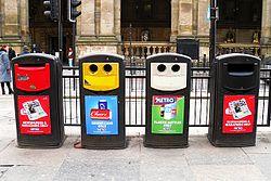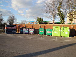 One of the major problems for recycling at home has been the provision of multiple containers to sort the waste. This has been criticised for being too confusing for many residents, with one of the biggest offenders being the Newcastle-under-Lyme council which implemented a nine-bin system in 2010.[27] Other councils have provided up to seven bins, although some private contractors provide only one, and separate the recyclable material themselves.[28]