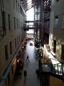 The 220,000-square-foot (20,000 m2)[12] building features the original façades along Princess Street, and incorporates modern green building technology. The Roblin Centre's construction merged five prominent heritage buildings on Princess Street as well as a 1905 warehouse on William Avenue.[13] The merging of these buildings incorporates a former lane into the current Atrium.[13] Many of the architectural features of the original buildings, such as wood columns, floors, brickwork, millwork, and windows were restored and incorporated into the new structure.[14]