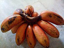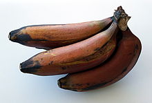 Red bananas are a group of varieties of banana with reddish-purple skin. Some are smaller and plumper than the common Cavendish banana, others much larger. When ripe, raw red bananas have a flesh that is cream to light pink in color. They are also softer and sweeter than the yellow Cavendish varieties, some with a slight raspberry flavor and others with an earthy one. Many red bananas are exported by producers in East Africa, Asia, South America and the United Arab Emirates. They are a favorite in Central America[1][2] as a form of aphrodisiac juice, along with being a favourite in India in order to promote fertility but are sold throughout the world.