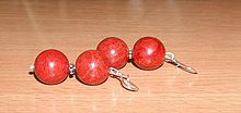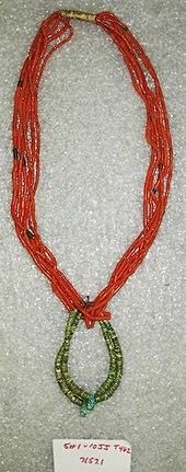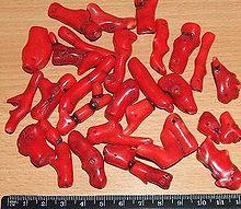 The hard skeleton of red coral branches is naturally matte, but can be polished to a glassy shine.[2] It exhibits a range of warm reddish pink colors from pale pink to deep red; the word coral is also used to name such colors. Owing to its intense and permanent coloration and glossiness, precious coral skeletons have been harvested since antiquity for decorative use. Coral jewellery has been found in ancient Egyptian and prehistoric European burials,[3] and continues to be made to the present day. It was especially popular during the Victorian age.[5]