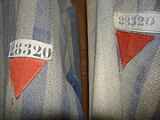 Red emblems of a political enemy on a Dachau detainee's clothing.^