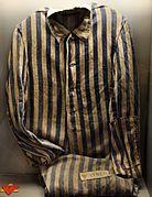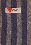 Detainees wearing civilian clothing (more common later in the war) instead of the striped uniforms were often marked with a prominent X on the back.[15] This made for an ersatz prisoner uniform. For permanence, such Xs were made with white oil paint, with sewn-on cloth strips, or were cut (with underlying jacket-liner fabric providing the contrasting color). Detainees would be compelled to sew their number and (if applicable) a triangle emblem onto the fronts of such X-ed clothing.[15]