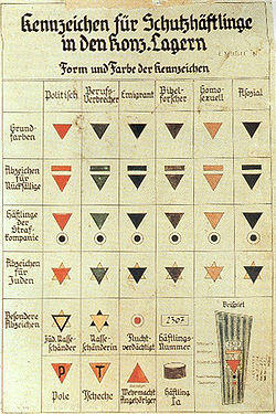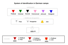 Nazi concentration camp badges, primarily triangles, were part of the system of identification in German camps. They were used in the concentration camps in the German-occupied countries to identify the reason the prisoners had been placed there.[1] The triangles were made of fabric and were sewn on jackets and trousers of the prisoners. These mandatory badges of shame had specific meanings indicated by their colour and shape. Such emblems helped guards assign tasks to the detainees. For example, a guard at a glance could see if someone were a convicted criminal (green patch) and thus likely of a tough temperament suitable for kapo duty.