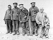 Black triangles visible on the trousers of Romani detainees at Dachau